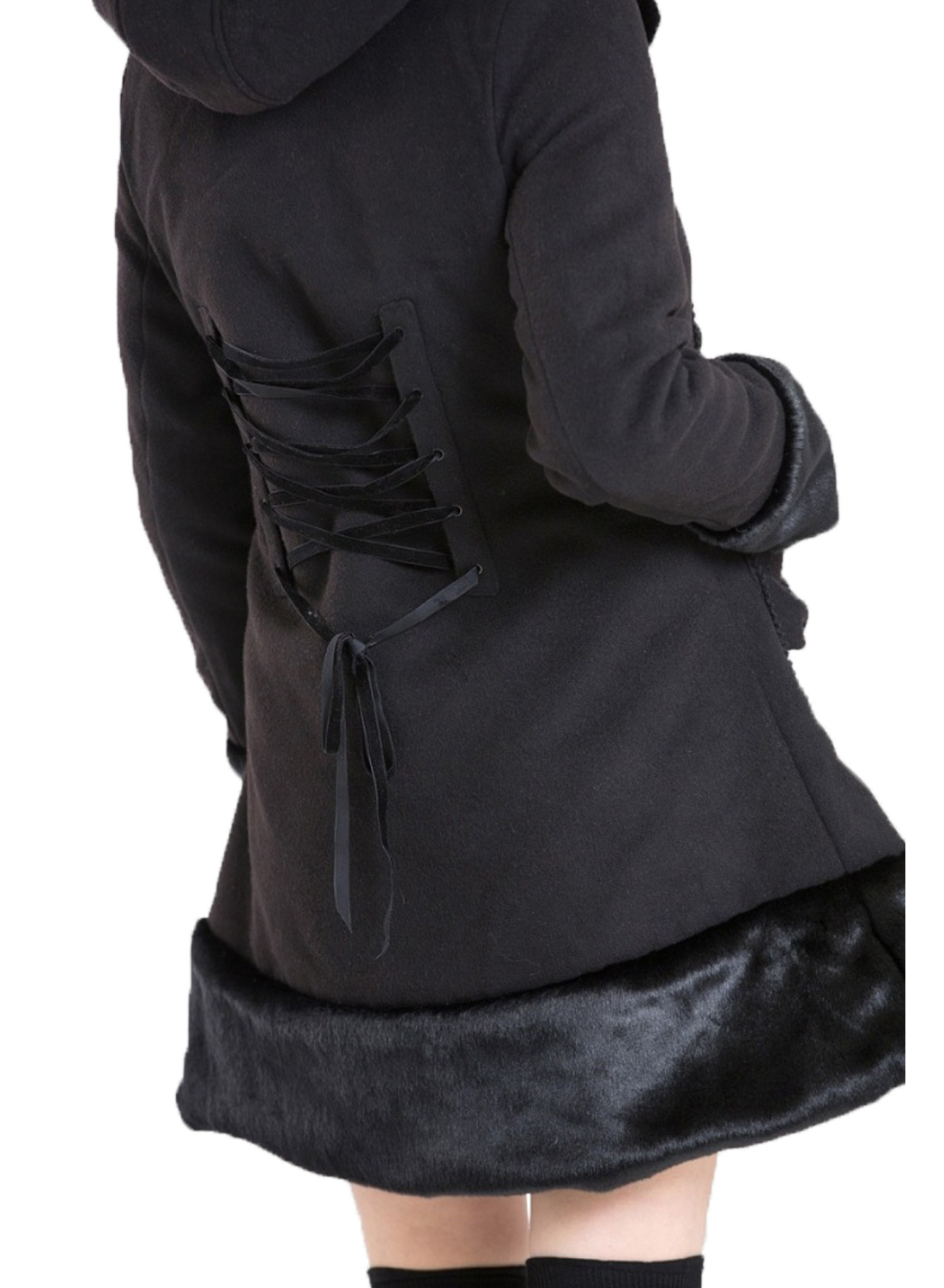 Hell Bunny Sera Jane Coat Black er den hyggeligste frakke, du kan finde med smuk imiteret pels, dobbeltradet front og korsetsnøring bagpå. Modellen er naturligvis fra Hell Bunny!