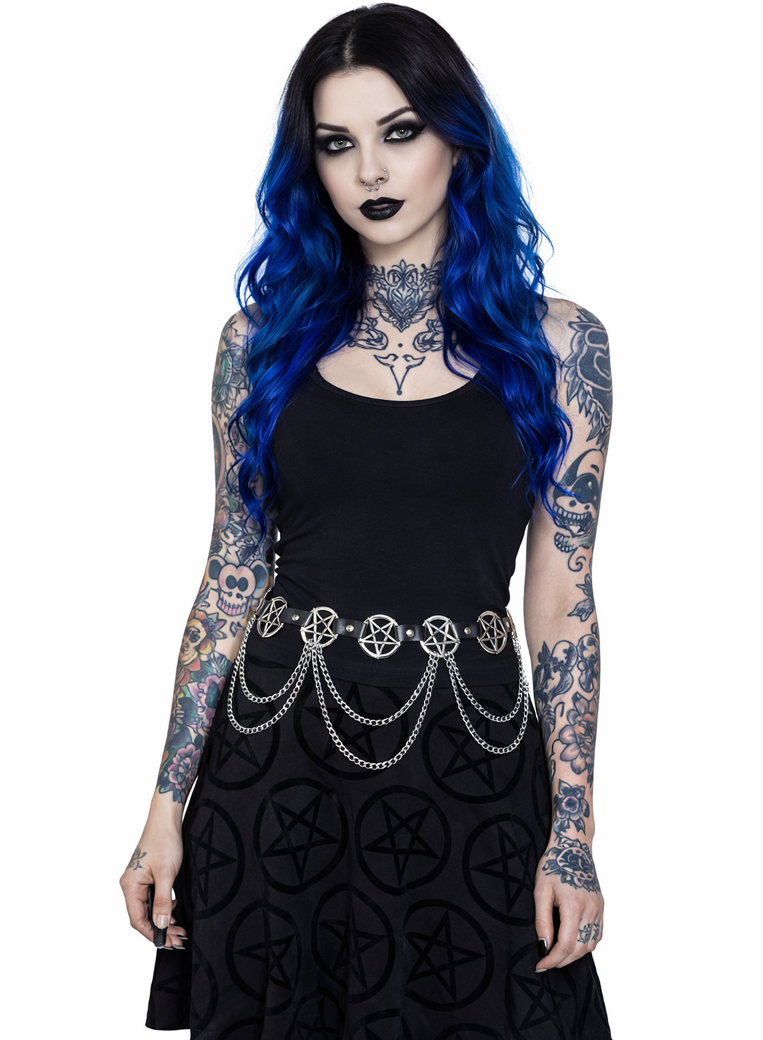Pentagram kæde Bælte er et bælte iGoth Rockstil, med flere metal pentagrammer og kæder.