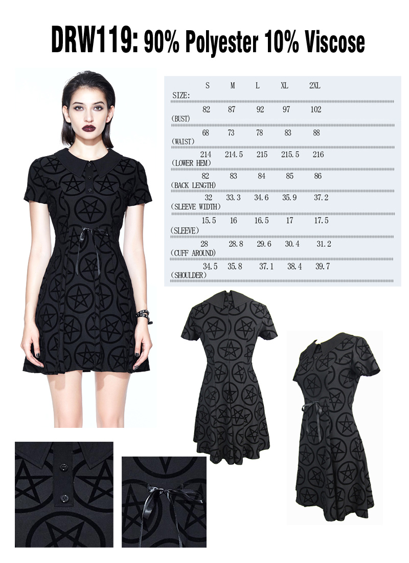 Pentagram Vampirela klänning från Restless ‘N’ Wild. En fantastiskt vacker klänning tillverkad i mjuk stretchjersey med svart krage och tre dekorativa knappar framtill med dragkedja i ryggen. Sidenband i midjan för bättre passform.